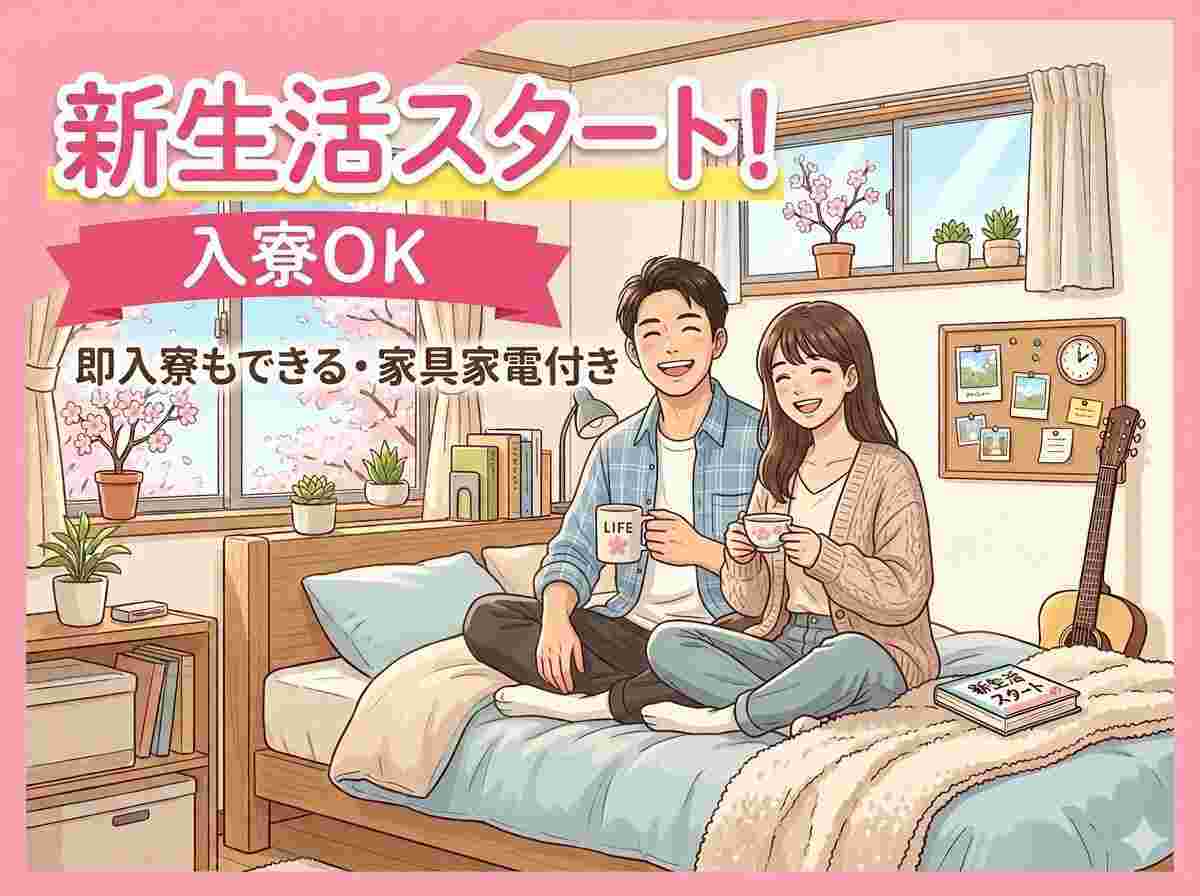 寮費無料のため、毎月の家賃負担を抑えながら働くことができます。さらに家具や家電が備え付けられている場合も多く、最低限の荷物だけで入居が可能です。引っ越し費用や準備の負担を減らしながら、すぐに生活をスタートできる点が魅力です。